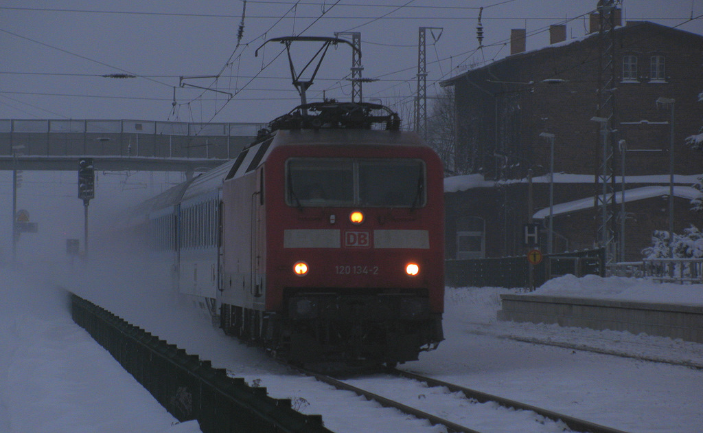 120 134-2 mit dem EC379 von Binz nach Brno hl.n. war dann der letzte EC des Tages (29.12.) für uns an der Dresdener Bahn (sehr empfehlenswert). Nun schon im fast dunkeln rauschte sie mit einigen blauen und wenigen roten CD - Wagen durch.