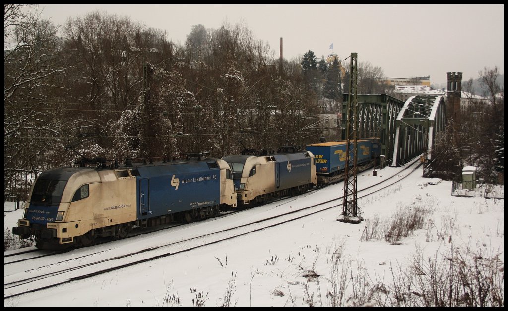 Auch ab Passau unterwegs waren ES 64 U2 024 und dahinter ES 64 U2 066. Sie hatten einen langen Containerzug am Haken. (Passau, 04.01.11)