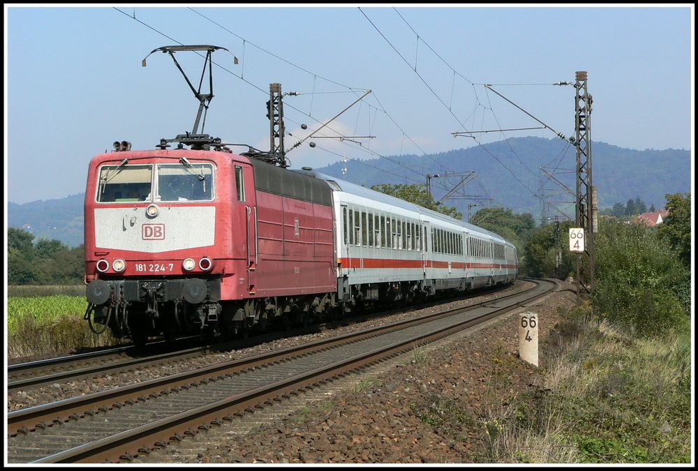 Die bereits abgestellte, orientrote 181 224 war am 23.09.2007 noch eifrig im Dienst, als sie mit IC 2158 bei Lützelsachsen aufgenommen werden konnte.