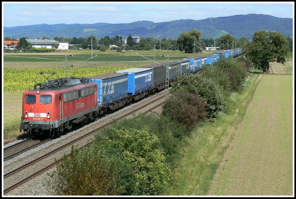 Während man heute die Baureihe 140 vor KV-Zügen auf der Oberrheinstrecke überhaupt nicht antrifft, so waren 140er mit jenen Zügen vor 3 Jahren keine Seltenheit. So konnte auch 140 432 am 15.09.2007 gesehen werden, die mit dem TEC 40139 gerade Großsachsen-Heddesheim passiert.