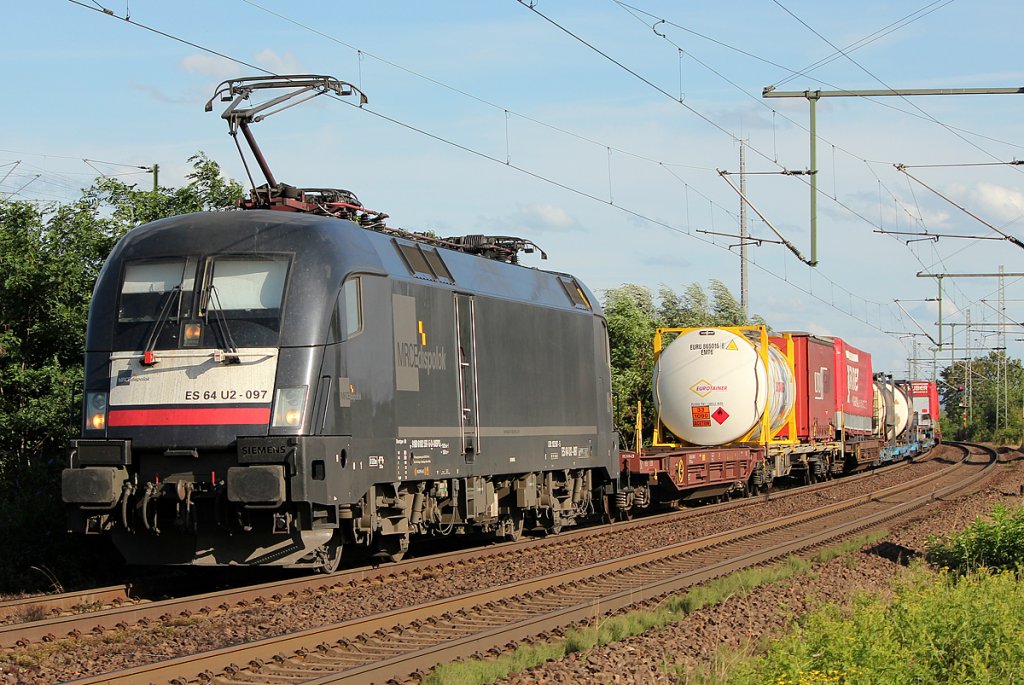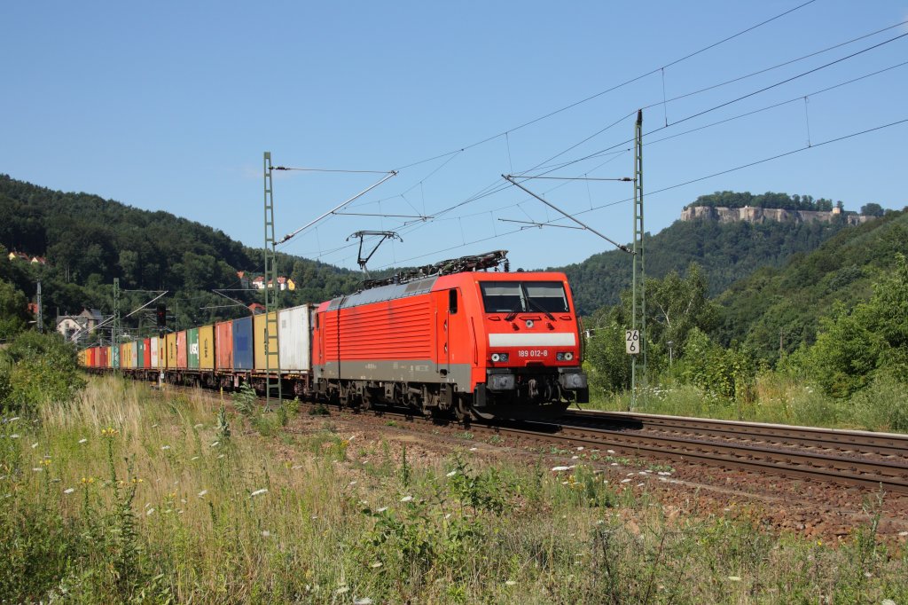 Mit einem Containerzug ist 189 012-8 im Elbtal auf dem Weg in Richtung Decin. Fotografiert am 09.07.2011 in Königstein.