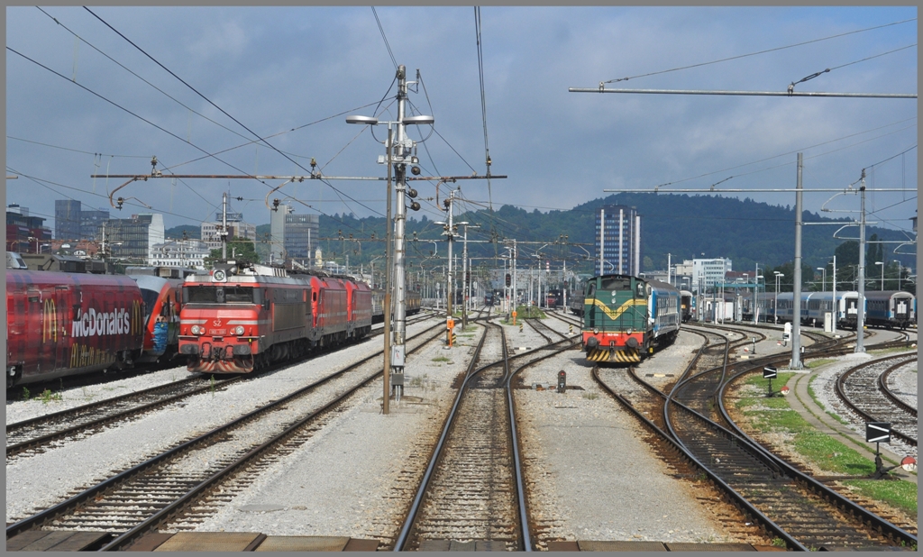 Ausfahrt aus Ljubljana mit 363-030 und Rangierlok 643-034. (02.07.2011)