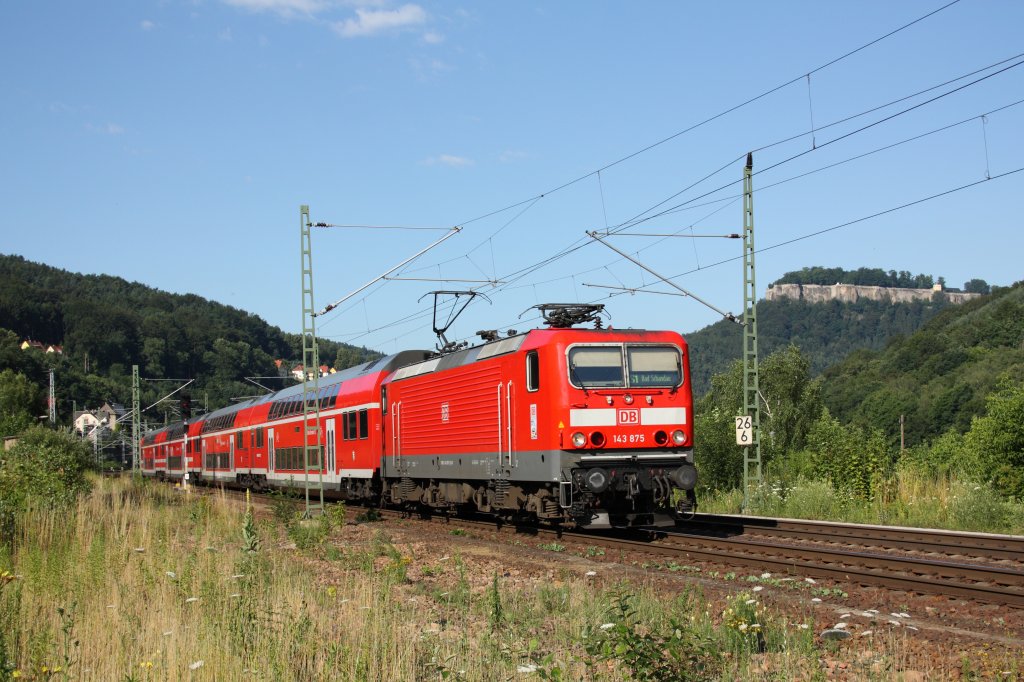 Bis zum Fahrplanwechsel im Dezember 2010 nie fotografiert, doch dann waren sie auf einmal weg: die 143er auf der Linie S1 der S-Bahn Dresden. Im Moment kann man jedoch den einen oder anderen Umlauf mit der Baureihe 143 beobachten. Hier ist 143 875-3 auf dem Weg von Meißen nach Bad Schandau in Königstein zu sehen. Fotografiert am 09.07.2011.
