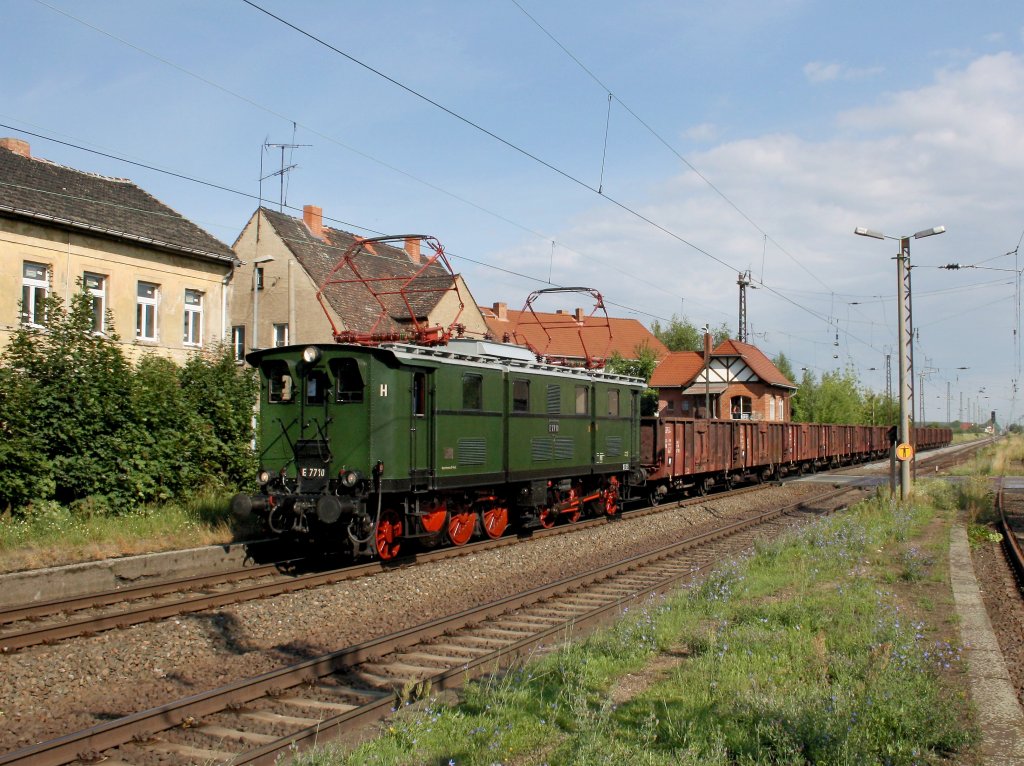Die E 77 010 am 09.07.2011 mit einem Fotogüterzug unterwegs bei Böllberg-Wörmlitz.