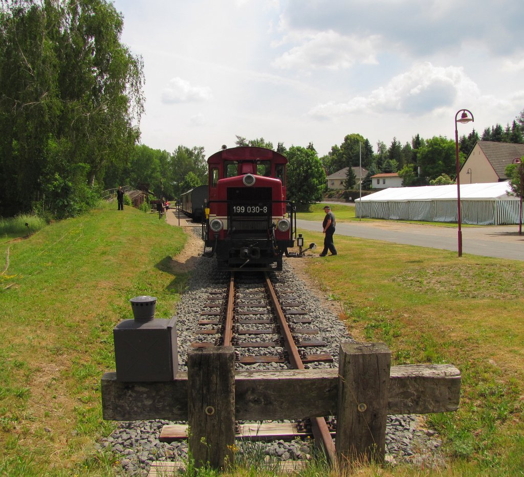 Döllnitzbahn 199 030-8 in Glossen, dem Endbahnhof der Döllnitzbahn; 09.06.2011