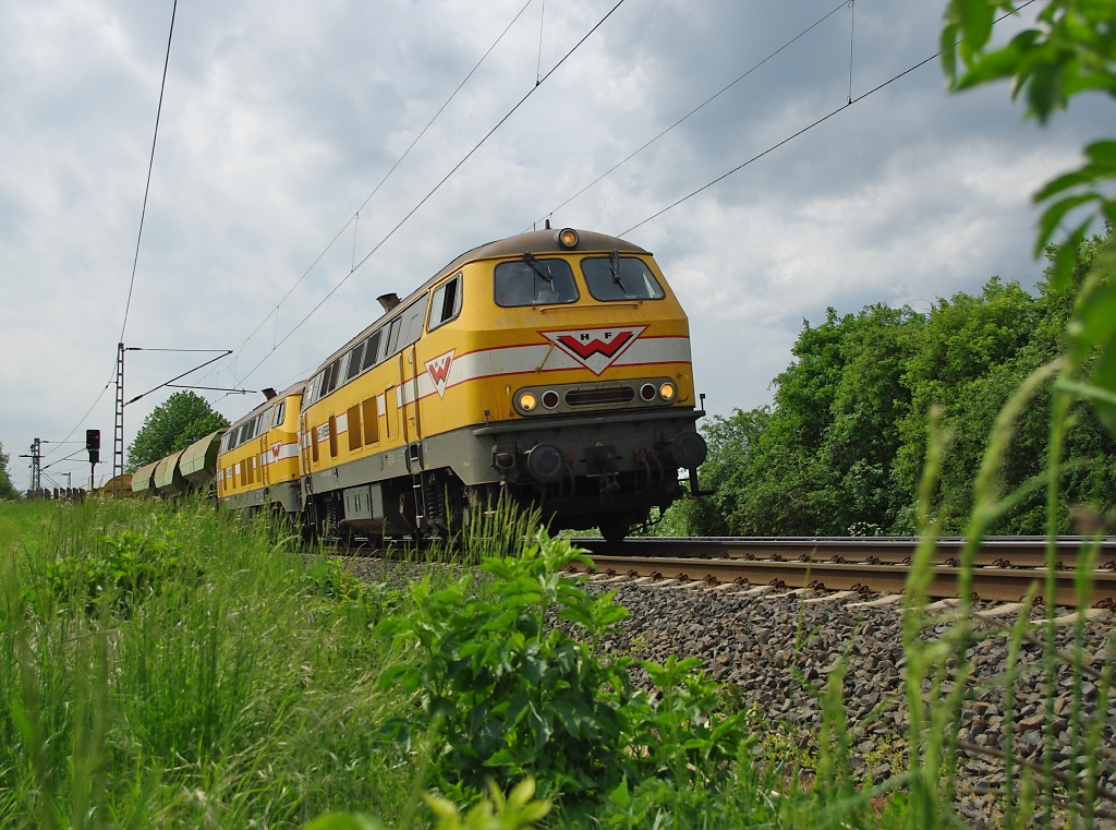 Doppelte Wiebe-Power: 216 122 und 216 012 an einem Wiebe Schotterzug in Fahrtrichtung Norden. Aufgenommen am 14.05.2011 zwischen Eichenberg und Friedland(HAN).