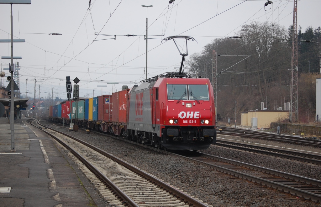 OHE 186 133-5 mit einem Containerzug am 19.02.2011 durch Kreiensen. Gruß an den Tf!