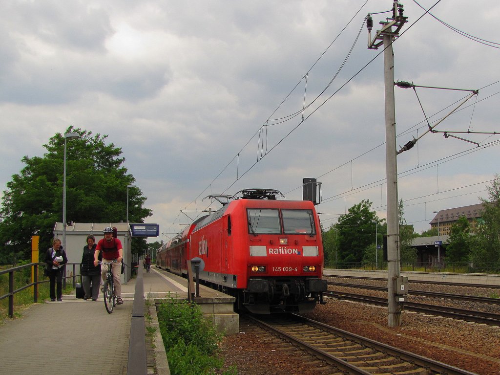 Railion 145 039-4 mit dem RE 10577 "SAXONIA" von Leipzig Hbf nach Dresden Hbf, bei der Ausfahrt in Oschatz Hbf; 09.06.2011