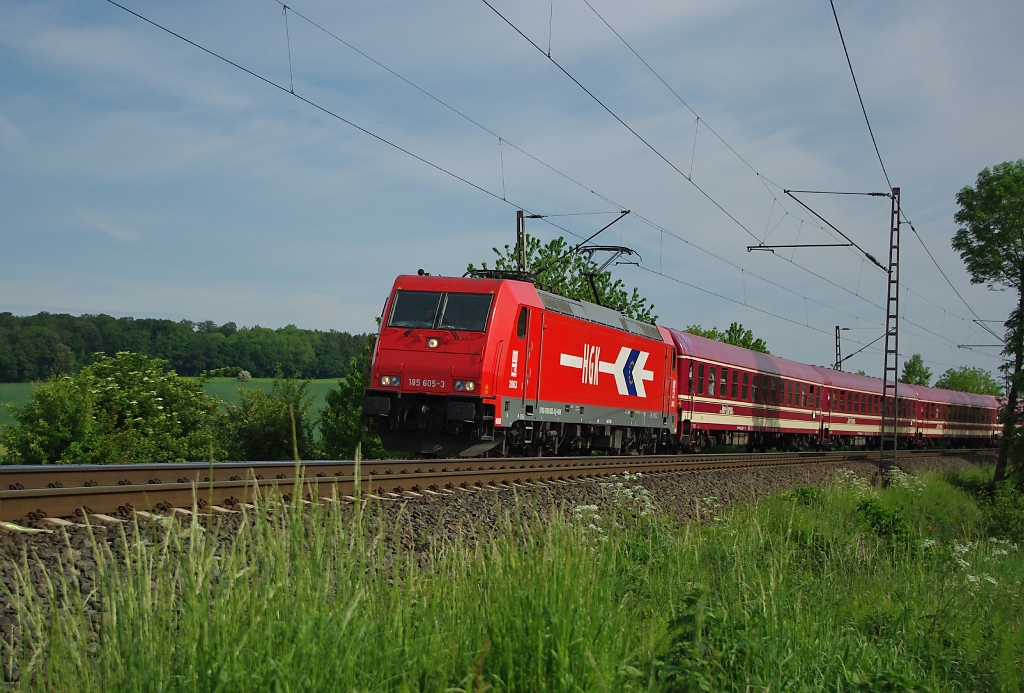 Und, da aller guten Dinge drei sind: Fußballsonderzug Nr. 3 am 14.05.2011: 185 605-3 der HGK für Vfl Wolfsburg nach Hoffenheim. Aufgenommen zwischen Friedland(HAN) und Eichenberg.