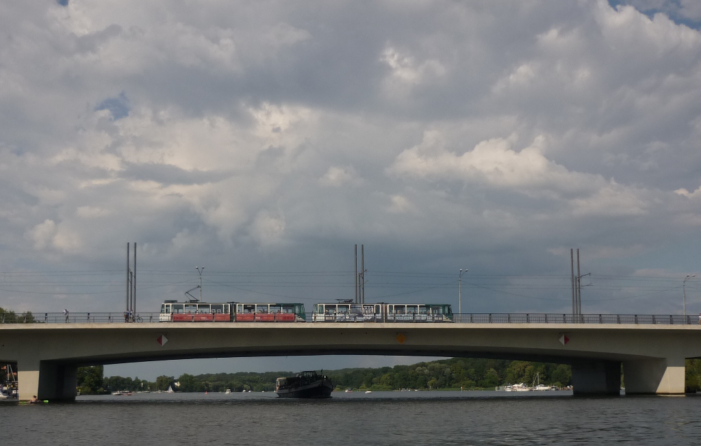 Während der Tatra-Zug aus den Wagen 148 ('Thalia-Kinos') und 248 ('SV Babelsberg 03') die Humboldt-Brücke aus Babelsberg kommend in Richtung Innenstadt überquert, hat das Dampfschiff 'Gustav' schon den Schornstein eingeklappt, um darunter durch zu fahren. Potsdam, 2011-07-09.