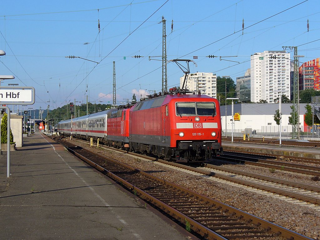 120 115-1 zieht bei blauen Himmel 181 220-5 und verlässt als IC 2052 Stuttgart - Saarbrücken am 11.07.2011 Kaiserslautern Hbf