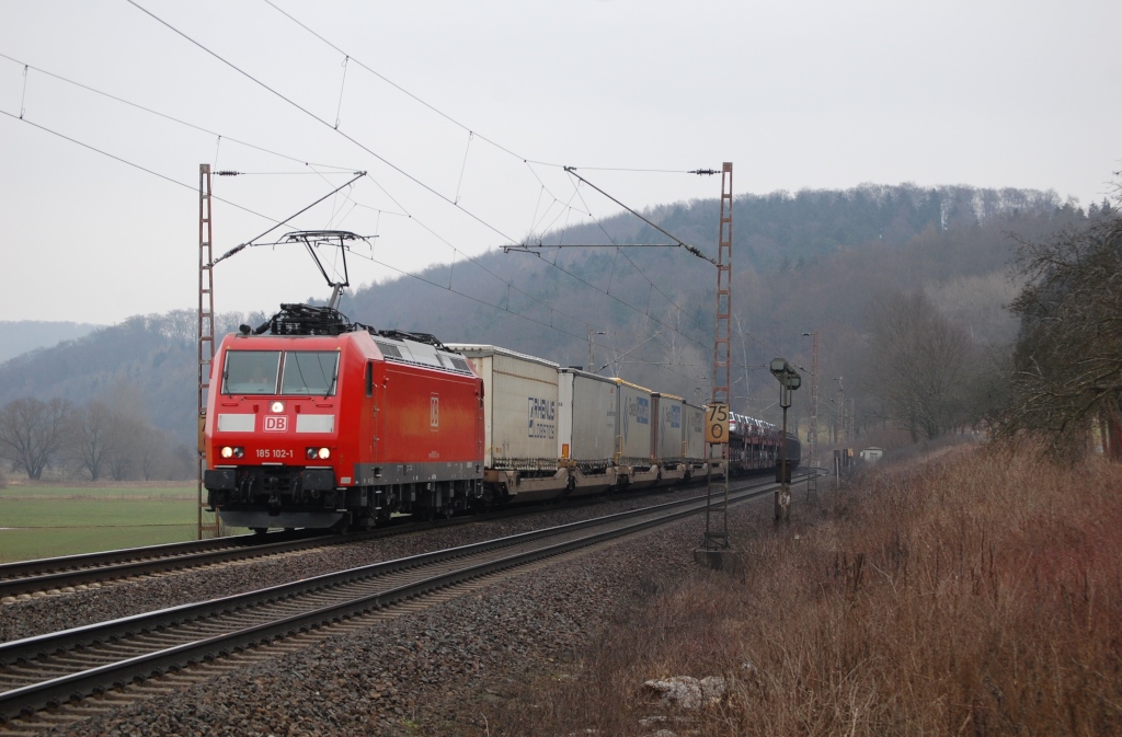 185 102-1 mit einem gemischten Güterzug am 19.02.2011 am Bü km 75,0 bei Einbeck-Salzderhelden.