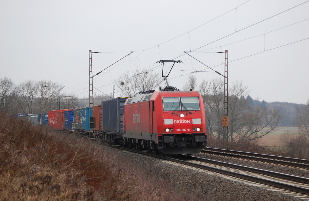 185 207-8 mit einem Containerzug am 19.02.2011 kurz hinter Salzderhelden