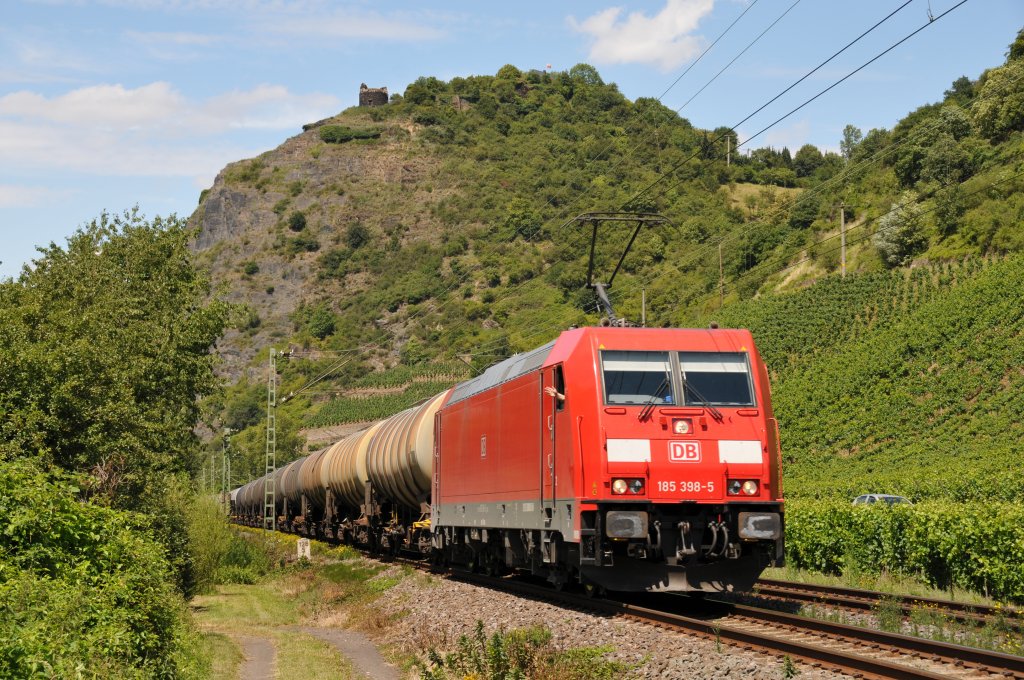 185 398-5 zieht einen Ölzug auf der rechten Rheinstrecke in Richtung Süden. Aufgenommen am 09/07/2011 bei Leutesdorf. Gruß an den TF.