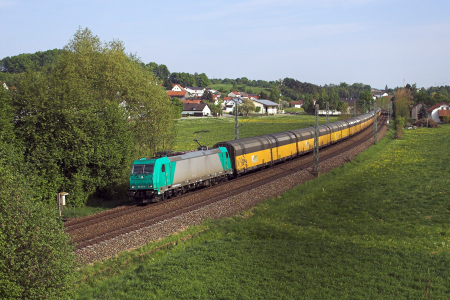185 614 am 02.05.2011 mit Autowagen im Anhang bei der Fahrt Richtung Regensburg. Der Zug hat gerade Ergoldsbach passiert und erreicht gleich Neufahrn (Niederbayern).