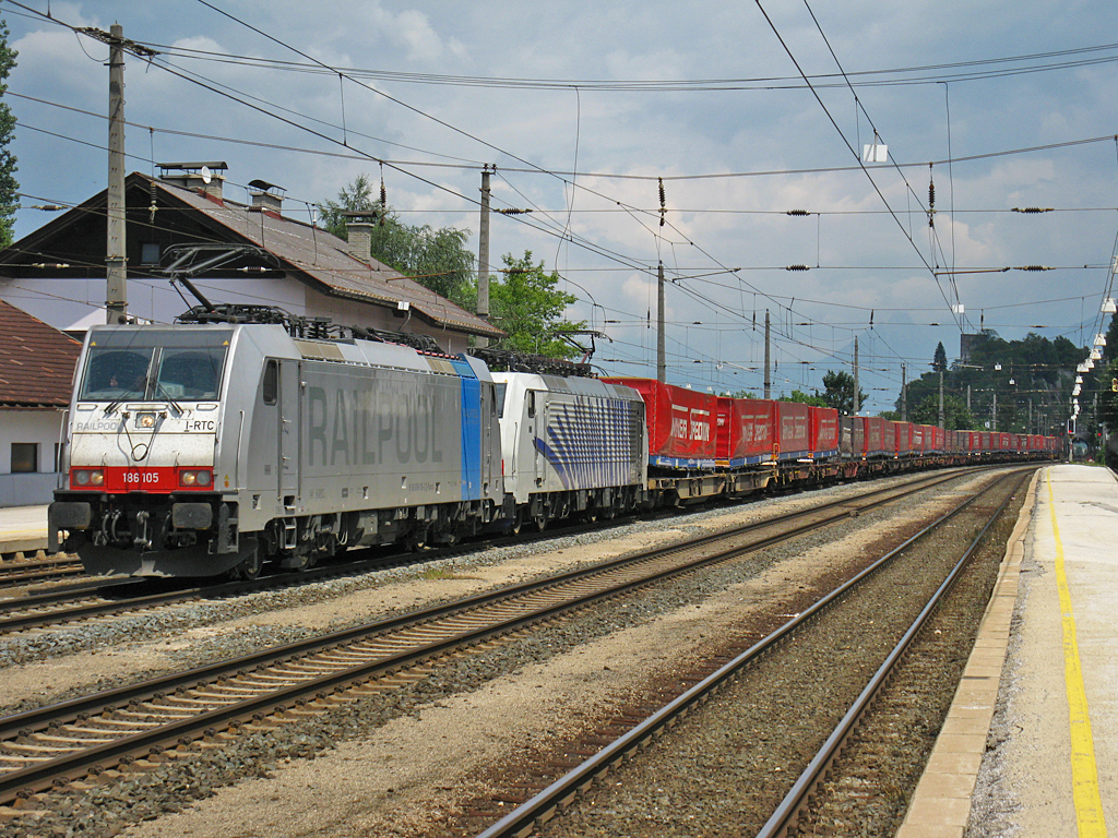 186 105 und 189 917 mit dem Winner-Express durch Brixlegg Richtung Italien am 5.7.2011.