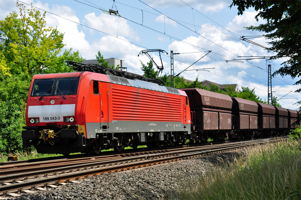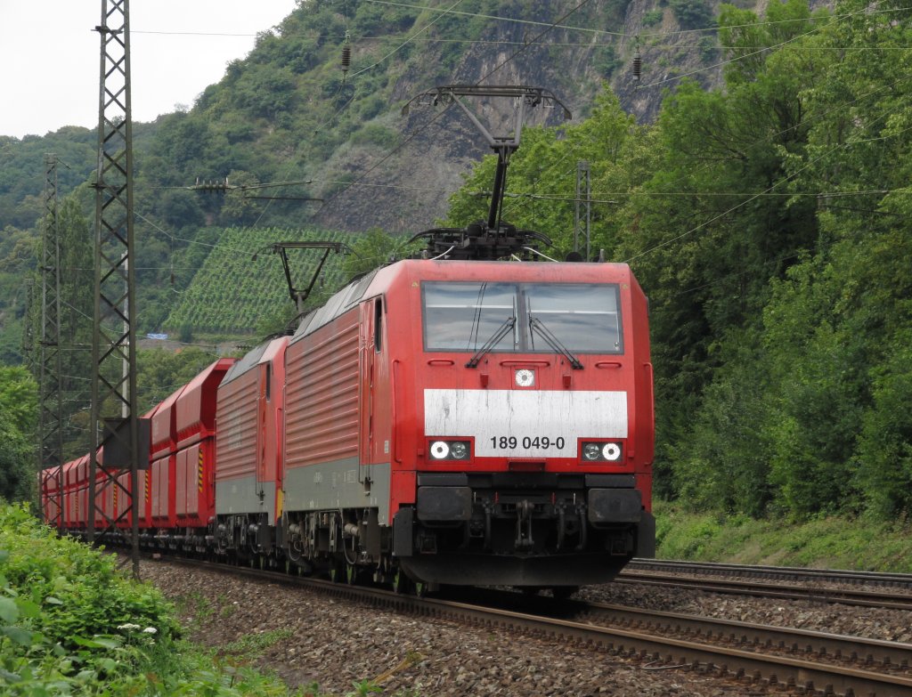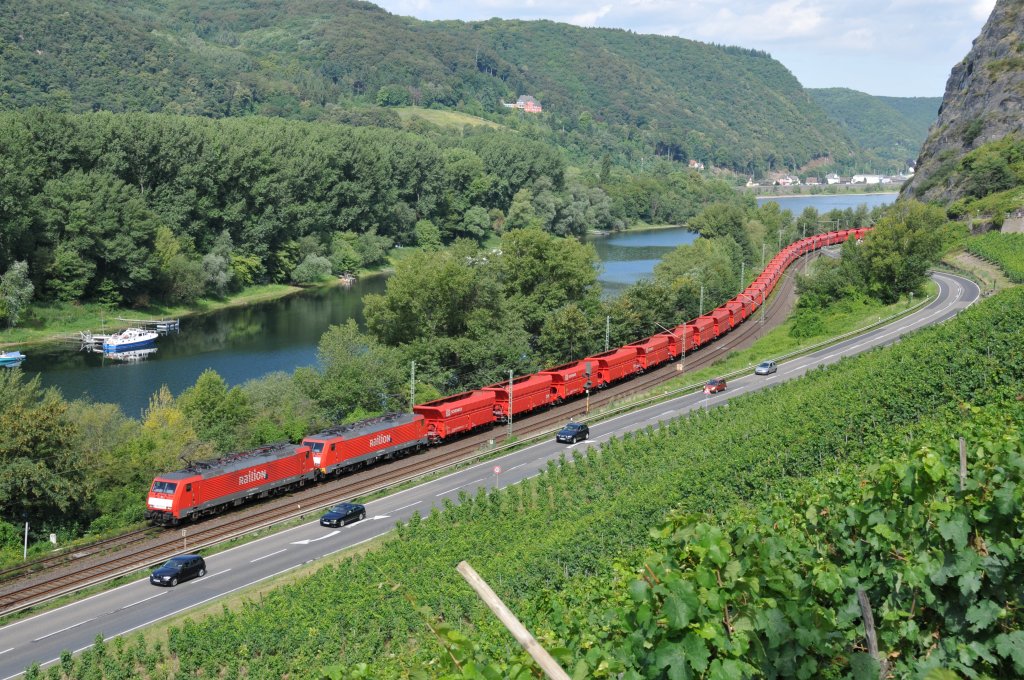 Wie ein roter Lindwurm schlängeln sich 189 078-9 und 189 040-9 mit ihrem leeren Kohlenzug rheinabwärts. Aufgenommenam 09/07/2011 bei Leutesdorf.