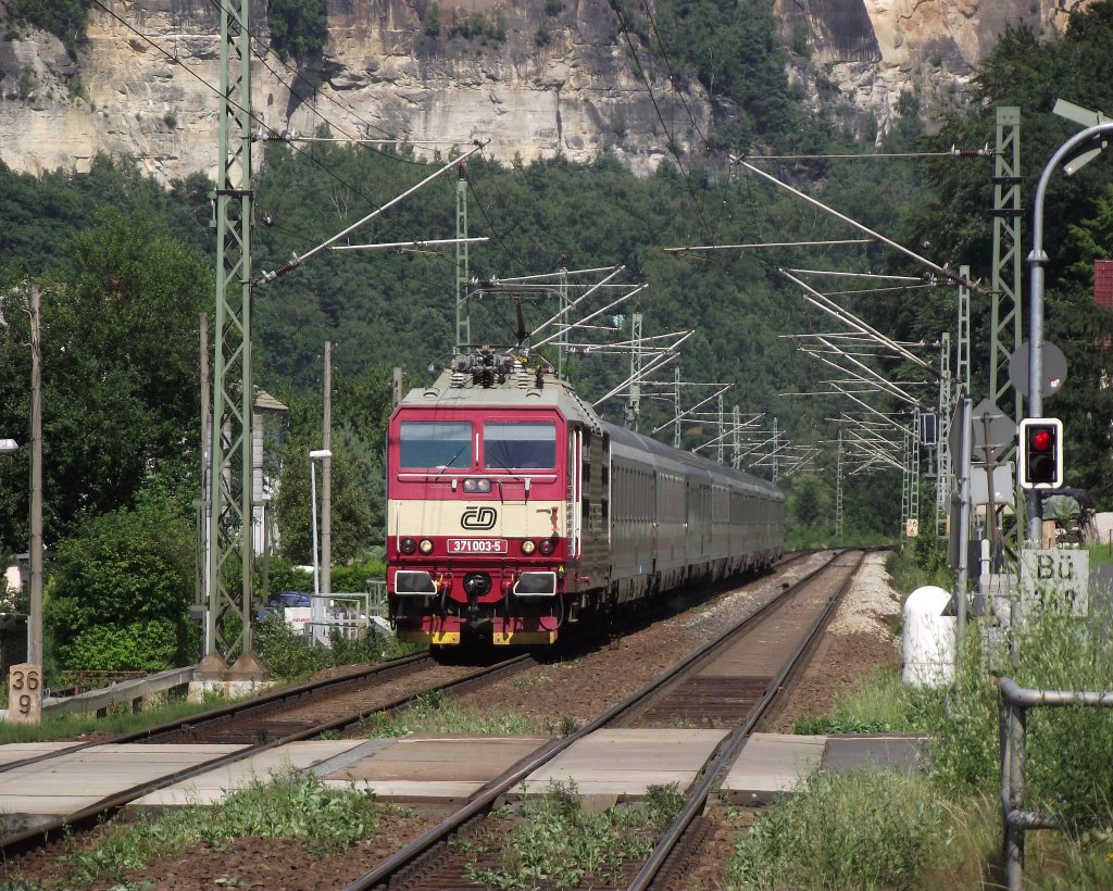 371 003-5 der CD ist am 10. Juli 2011 mit EC 172 auf der Elbtalbahn bei Wehlen (Sachs) Richtung Dresden unterwegs.