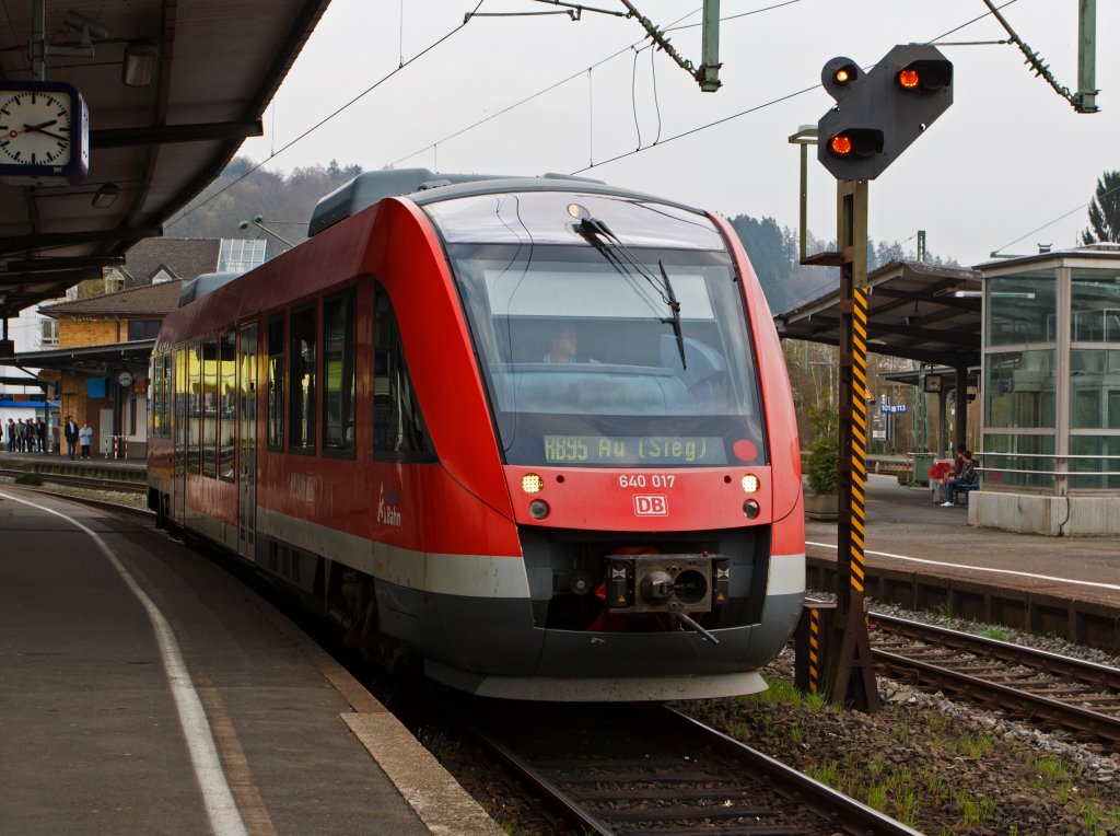 640 017 (LINT 27) der 3-Länder-Bahn als RB 95 (Sieg-Dill-Bahn) nach Au/Sieg fährt am 03.04.2011 im Bahnhof Betzdorf/Sieg ab.