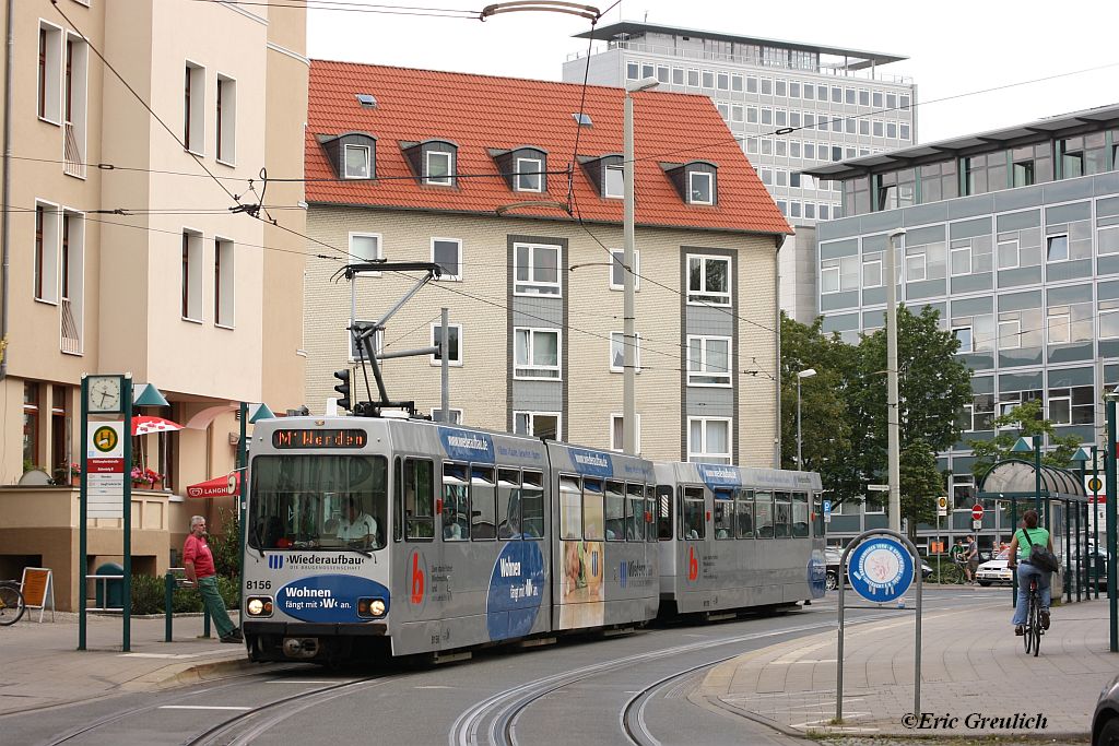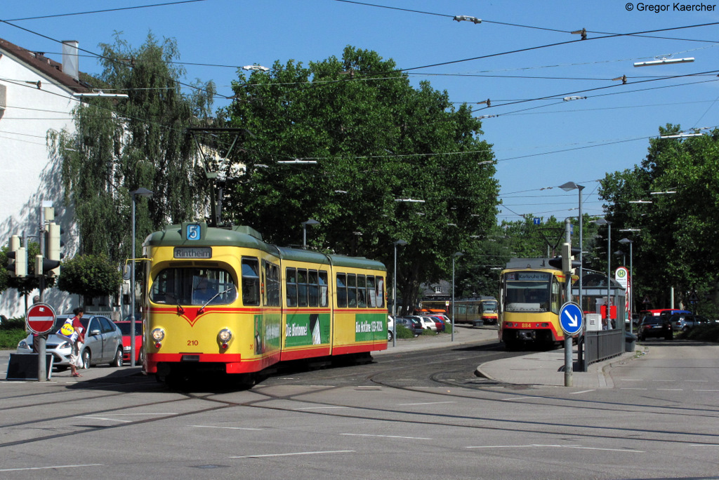 Nachdem der TW 884 das Gleisdreieck und die Station Rintheimer Straße nonstop passiert, biegt Wagen 210 in die Rintheimer Straße ein und macht sich auf den Weg zu seinem Ziel. Karlsruhe, 09.07.2011.