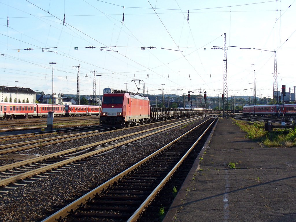 Am 11.07.2011 zieht 186 327-3 einen Flachwagenzug durch Kaiserslautern