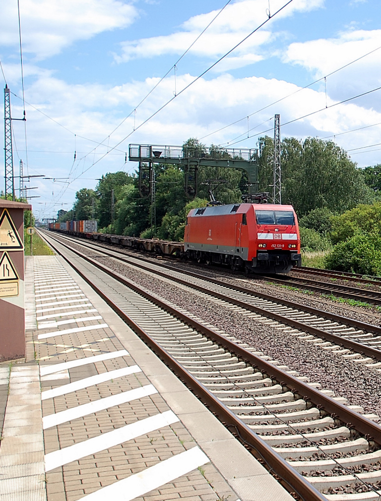 Aus Seelze kommend fährt die 152 131-9 mit einem Containerzug durch den Bahnhof Dedensen-Gümmer. 9.7.2011