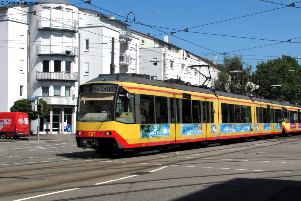 Bauarbeiten zwischen Tullastraße und Durlacher Tor erfordern vom 09.07.11 bis 10.09.11 Umleitungen der Linien 1, S4 und S5. Hier TW 867 "Bad Wildbad Tourismus - Wir bringen Sie zu Therme und Tanne" zusammen mit Wagen 887 als S4 nach Heilbronn an der Kreuzung Tullastraße/Rintheimer Straße. Karlsruhe, 09.07.2011.