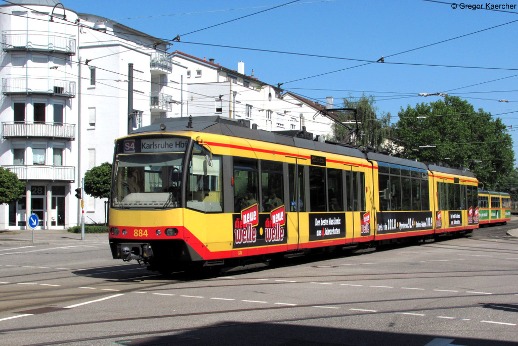Bauarbeiten zwischen Tullastraße und Durlacher Tor erfordern vom 09.07.11 bis 10.09.11 Umleitungen der Linien 1, S4 und S5. Hier TW 884, der für den Karlsruher Radiosender "die neue Welle" wirbt als S4 nach Karlsruhe Hbf an der Kreuzung Tullastraße/Rintheimer Straße. Karlsruhe, 09.07.2011.
