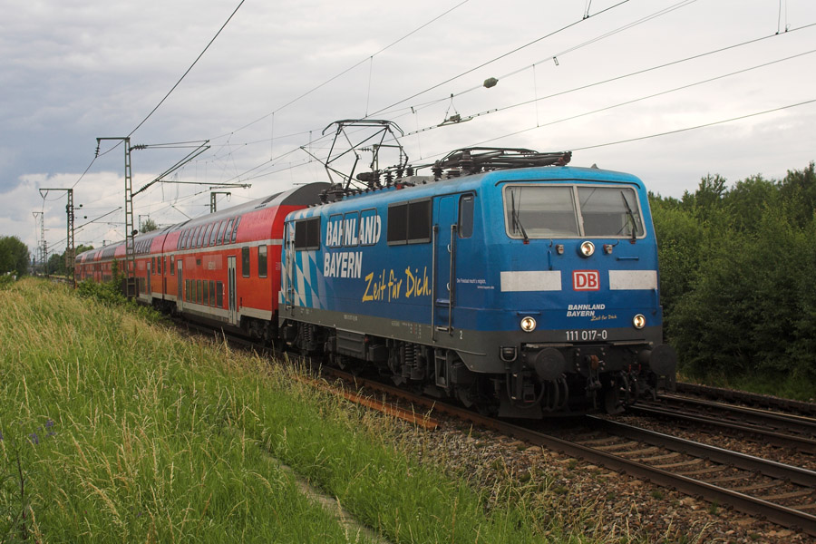 Bei einem bescheidenen Wetter zog am 13.06.2011 die 111 017 den RE 4261 nach München Hbf. Hier passiert das nördliche Weichenfeld von Obertraubling.