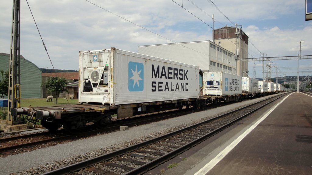 Der Bahnhof Däniken hat seit diesem Frühling wieder eine grössere Anzahl Güterwagen, die in die Industrie fahren. Am 08.07.11 stehen 7 beladene Container-Tragwagen mit Kühlcontainern bereit, um am Montag mit Toblerone-Schoggi beladen zu werden.