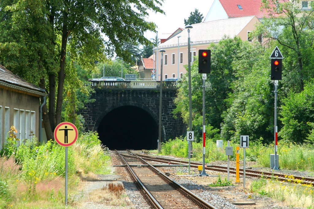 Der Kamenzer Stadttunnel (Nordportal) unter dem Bönischplatz. Er stellt zugleich die Südausfahrt des Kamenzer Bahnhofes in Richtung Pulsnitz, Arnsdorf, Dresden dar. (Aufnahme vom 01.07.2011)