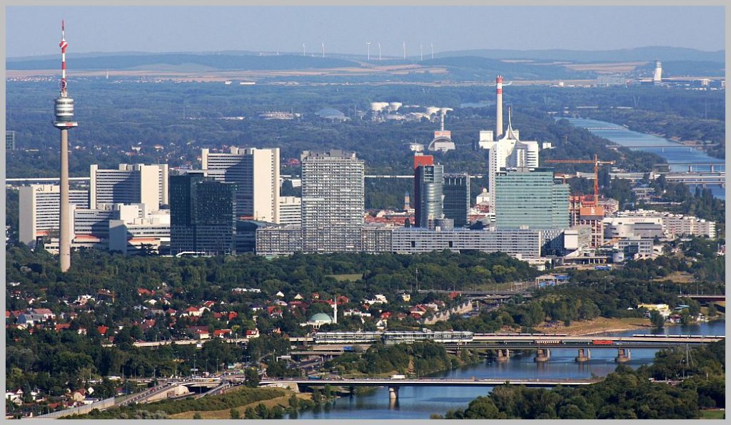 Die 2143 35 überquert mit EZ 7399 die Neue Donau/Wien. Die Aufnahme entstand am 10. Juli 2011 am Leopoldsberg.
