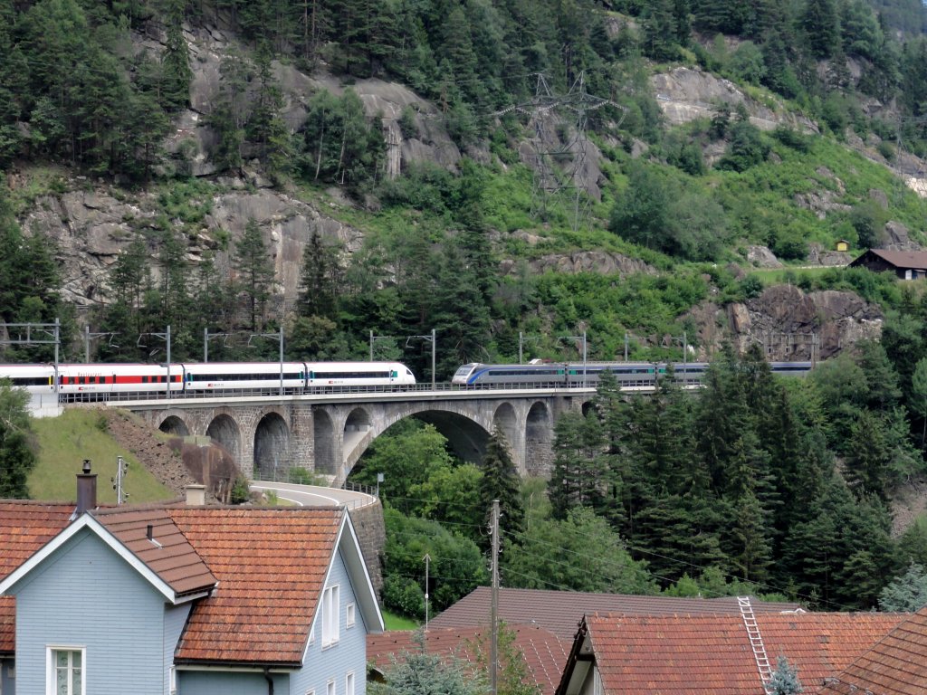 Die E 656 071 hatte am 22.06.2011 eine ETR 500 Wagenkompositionam Haken. Der erste Wagen dient wohl für die Übergangskupplung. Das Bild entstand bei Grisignano di Zocco.