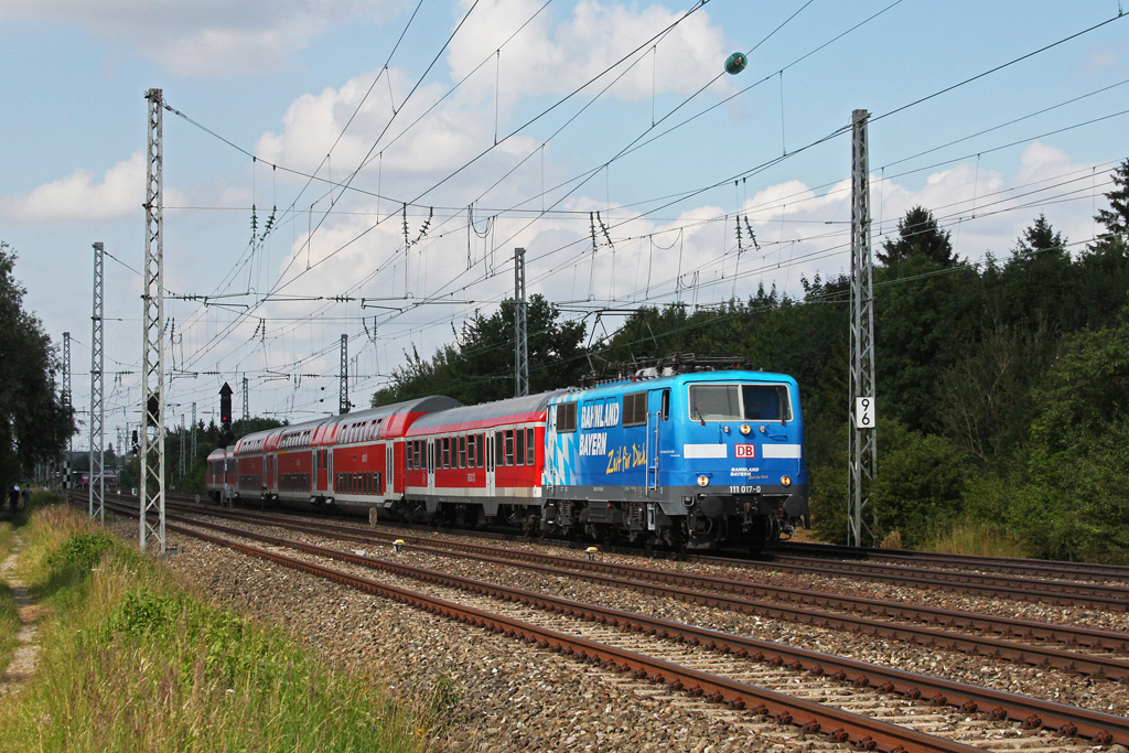 Es folgte der Maxl (111 017) mit RB 59525. Dieser wäre fast einer Fotowolke zum Opfer gefallen, aber die Sonne strahlte die Lok an, während die Wagen im Schatten waren. Aufgenommen am 04.07.2011 in München Westkreuz.