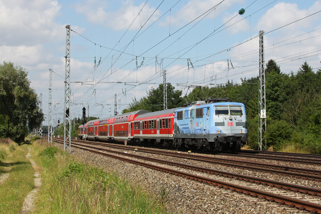 Zum Schluss kam noch die DAV Werbelok 111 039 mit RB 59527. Aufgenommen am 04.07.2011 in München Westkreuz.