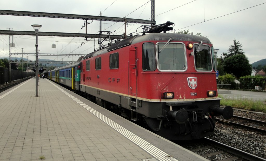 Kein Dispo-Zug: Die Re 4/4" 11226 steht am 11.07.11 mit einem IR nach Basel in Gelterkinden. Neben dem einten EW II in der Hauptkomposition, wurden 2 weitere "Papageien" als Verstärkungswagen eingereiht.