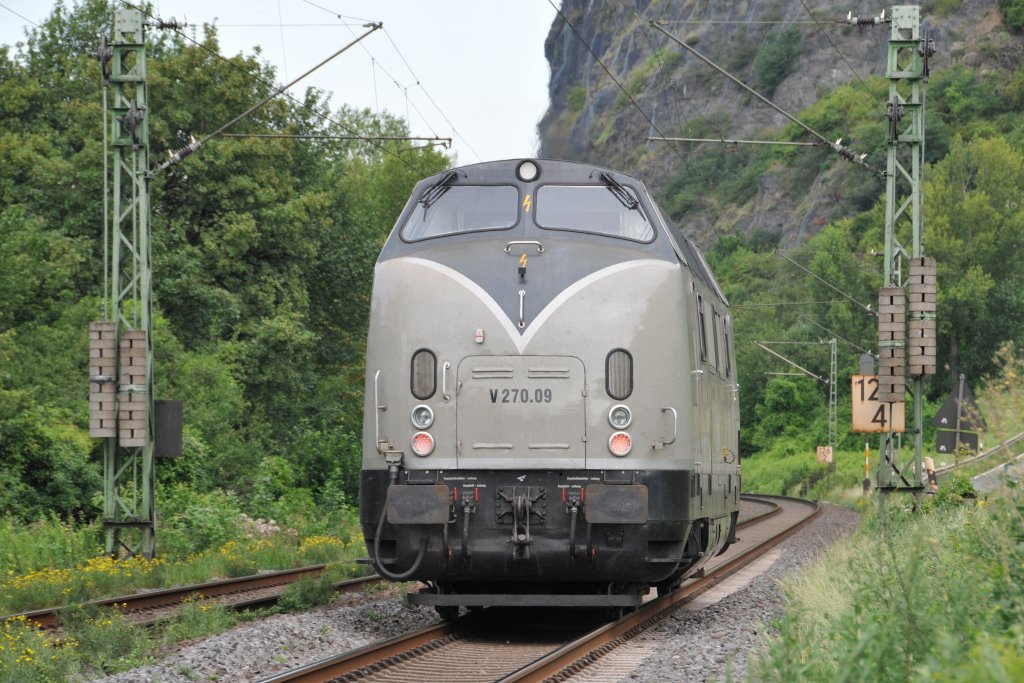 Nachschuß der V270-09 (ex 221 121) bei Leutesdorf. Das Bild entstand am 09/07/2011.