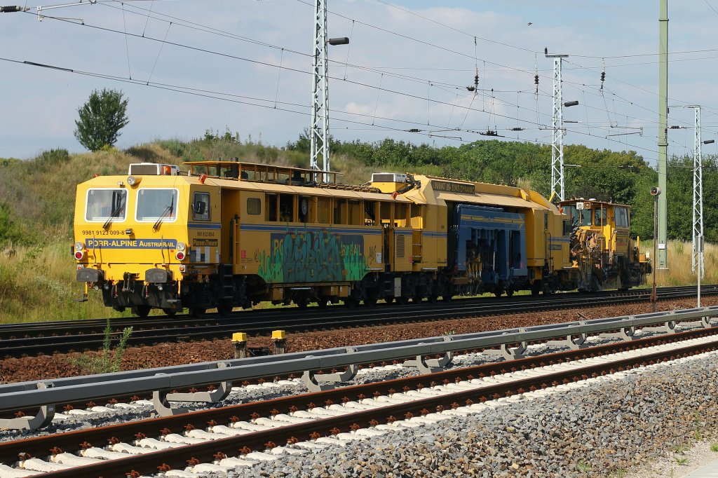 PORR-ALPINE AustriaRail mit NVR-Nummer 9981 9123 009-8 [Stopfmaschiene (PLM)]* nach der Durchfahrt durch Berlin Schönefeld Flughafen am 10.07.2011. *Geändert gemäß Kommentar von Walter Kirchmayr am 6. Februar 2012.