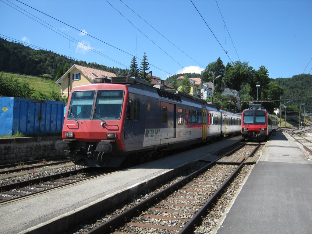 Zugskreuzung in Tavannes: Links; Ersatz Regio 5230, geführt mit einem 3-teiligem NPZ (560 118, REV) statt Domino, Rechts; Domino als Regio 5231 nach Sonceboz-Sombeval, 11.07.2011.