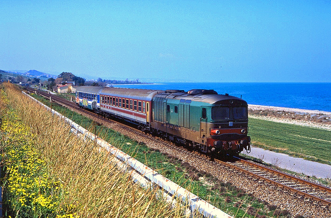 Die FS 633 050 mit einem Schnellzug nach Ventimiglia in San Remo im Juni 1985.