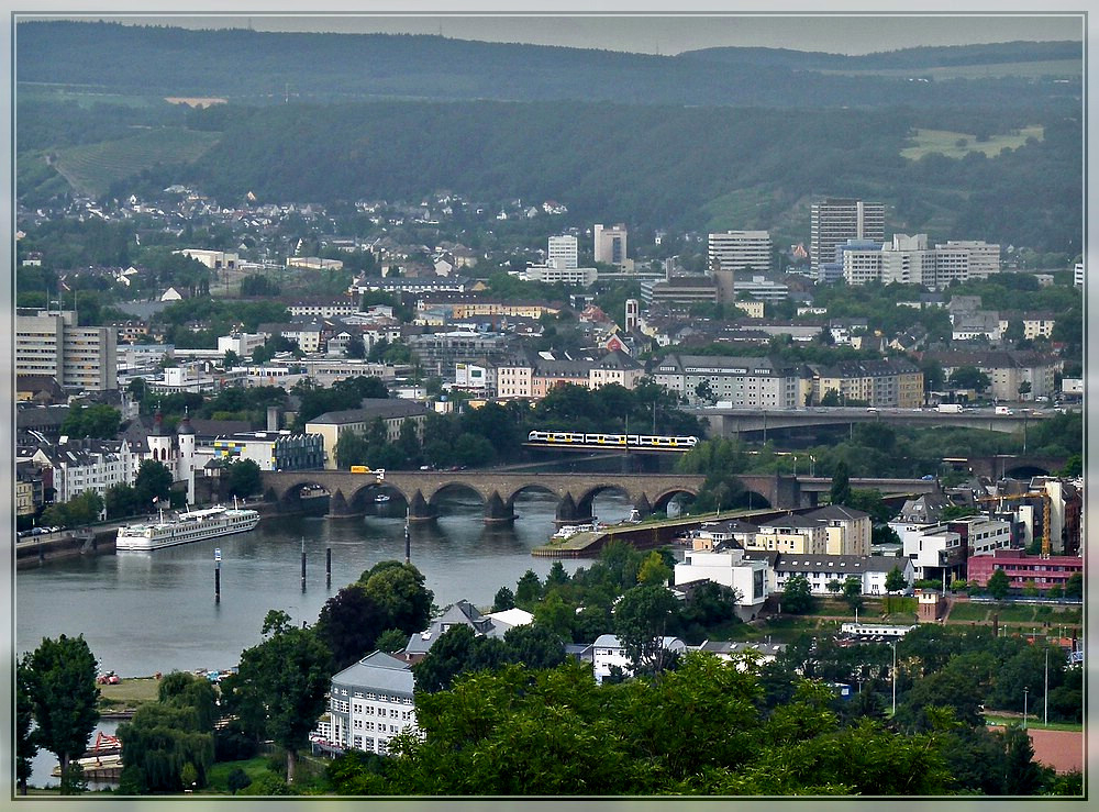 - Modellbahncharakter - Eine Trans regio Einheit befährt am 24.06.2011 die Moselbrücke in Koblenz. Das Bild wurde von der eigens für die BuGa errichtete Aussichtsplattform aus gemacht. (Jeanny)