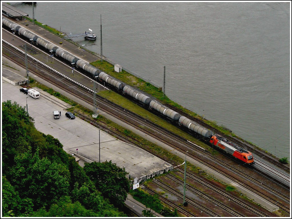 - Modellbahncharakter - Von der Festung Ehrenbreitstein kann man die Güterzüge fotografieren, die durch den Bahnhof Koblenz-Ehrenbreitstein donnern. 24.06.2011 (Hans)