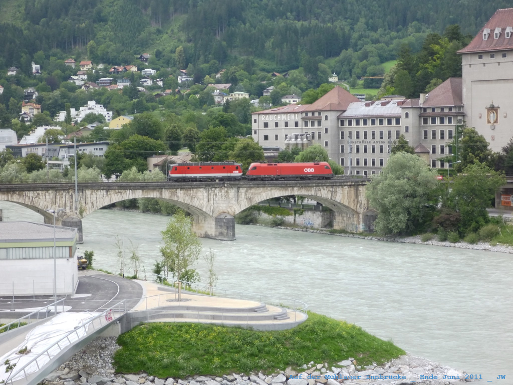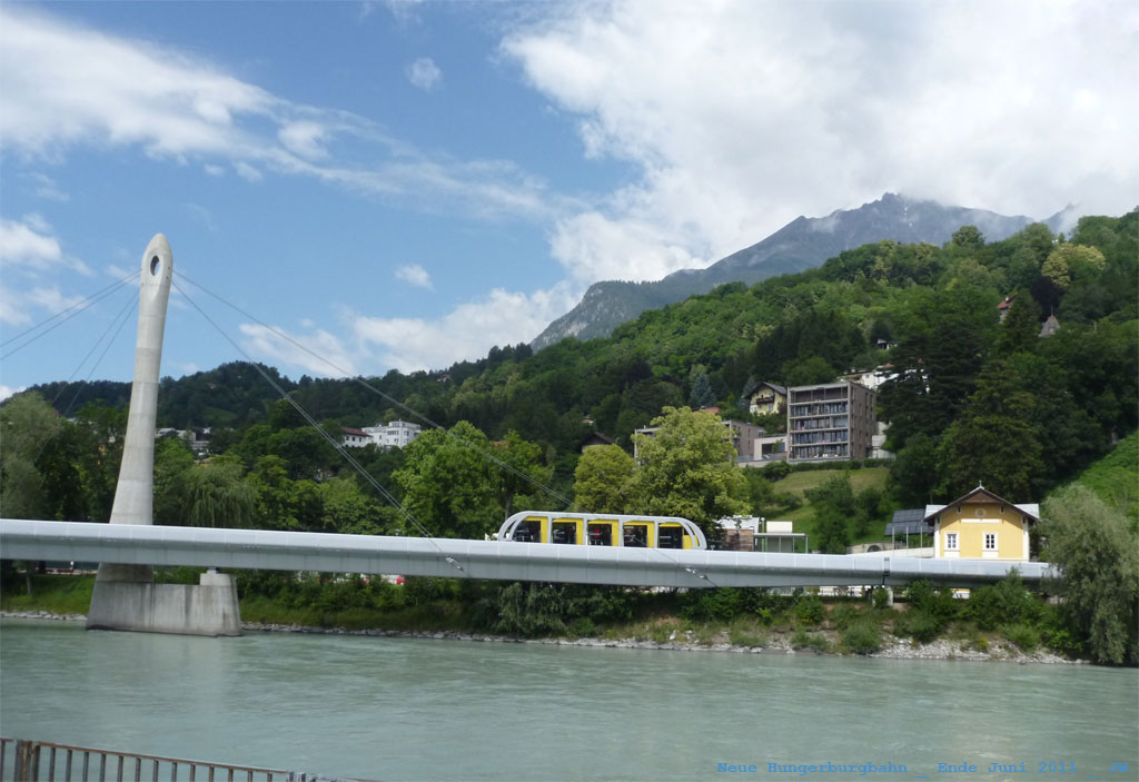 Wagen 2 der Neuen Hungerburgbahn quert den Inn auf der Schrägseilbrücke. Ende Juni 2011 kHds