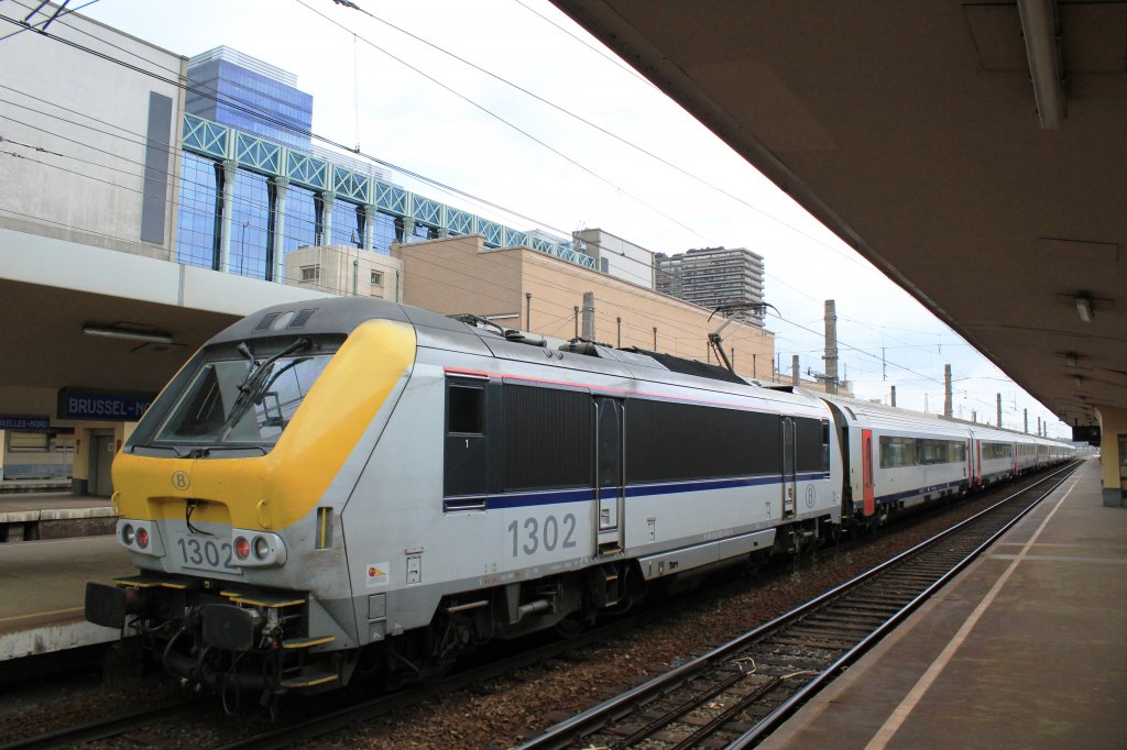 1302 schiebt am 8. Juli 2011 den IC 512 aus dem Brüsseler Nordbahnhof. Die Reise geht über Leuven und die Schnellfahrtstrecke 2 nach Lüttich und Eupen. Dass eine 13er mit "kleiner" Ordnungszahl, sprich 1301-1339, im Personenverkehr eingesetzt wird ist eher die Ausnahme.