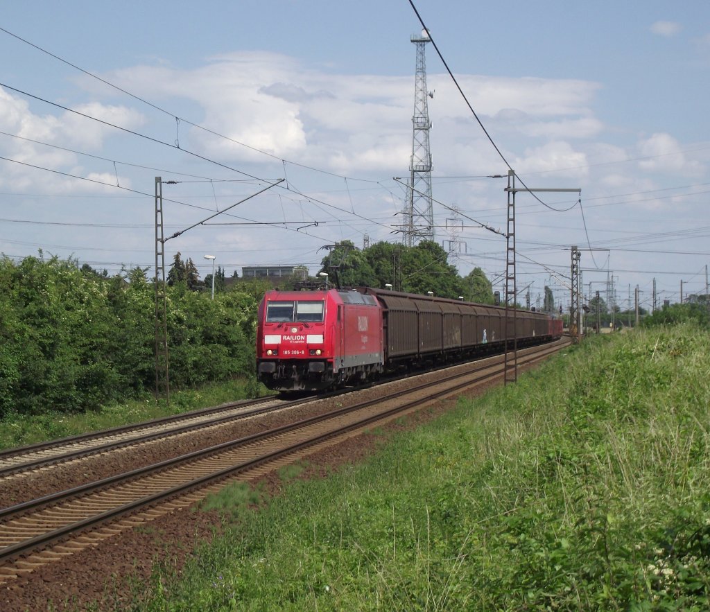185 306-8 ist am 9. Juli 2011 mit einem gemischtem Güterzug bei Ahlten Richtung Hannover unterwegs.