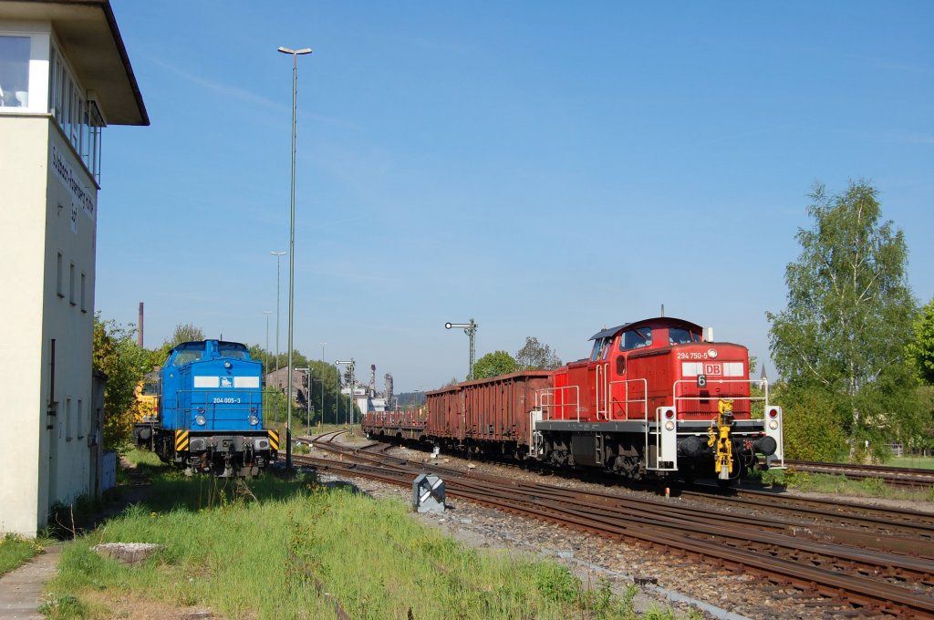 294 750 fährt am 06.05.2011 mit ihrer Übergabe aus Sulzbach-Rosenberg-Hütte in Richtung Amberg aus. Daneben steht noch 204 005 der PRESS