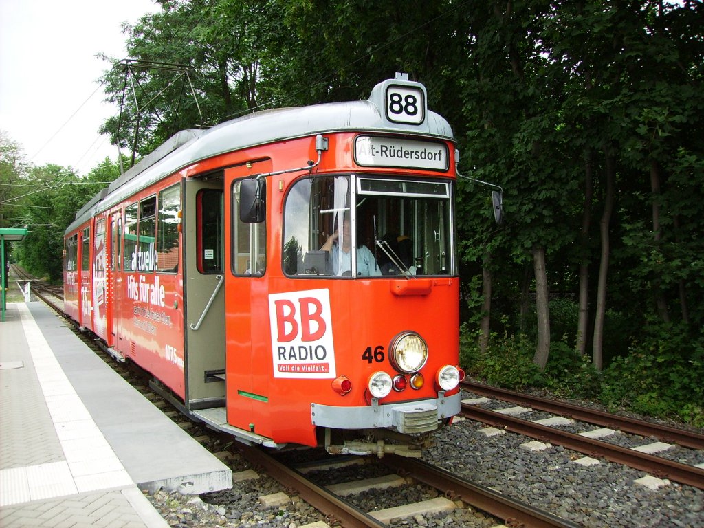 Am 23.06.2011 wartet TW 46 als Tram 88 der SRS in der Endstelle Alt-Rüdersdorf auf seine Rückfahrt nach Friedrichshagen.