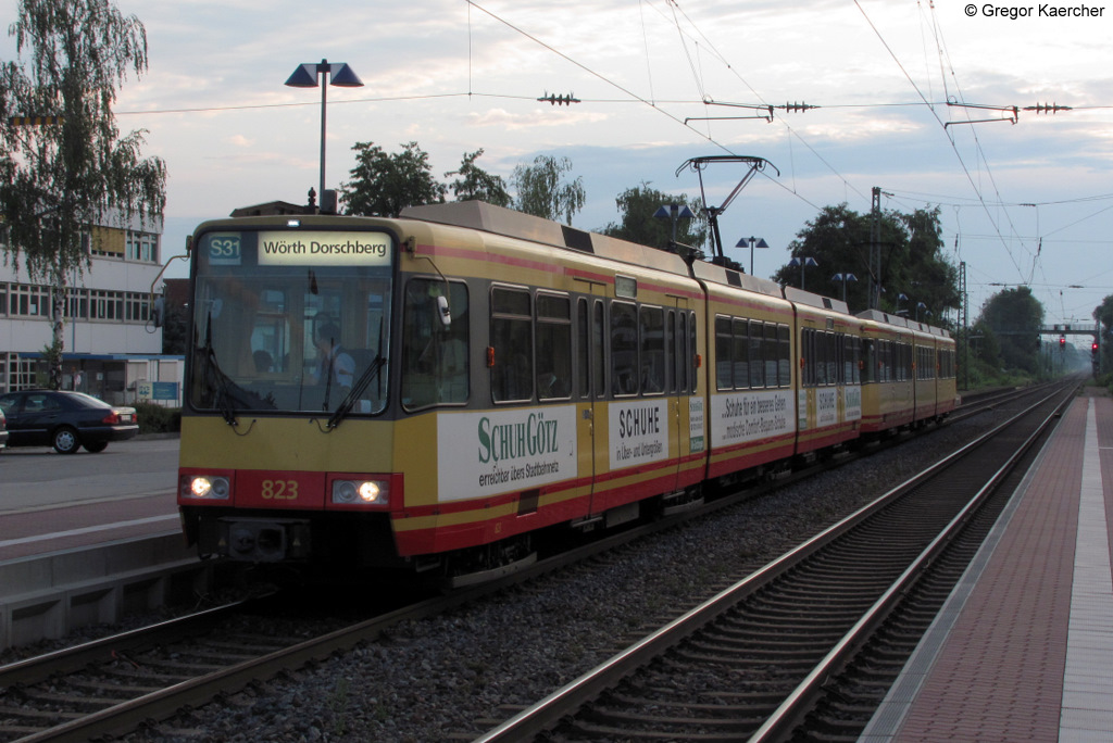 Am Morgen des 06.07.2011 fährt Wagen 823 mit einem weiteren Triebwagen die morgendliche Verbindung von Menzingen bis nach Wörth (Rhein). Hier hält das Duo in Weingarten (Baden).