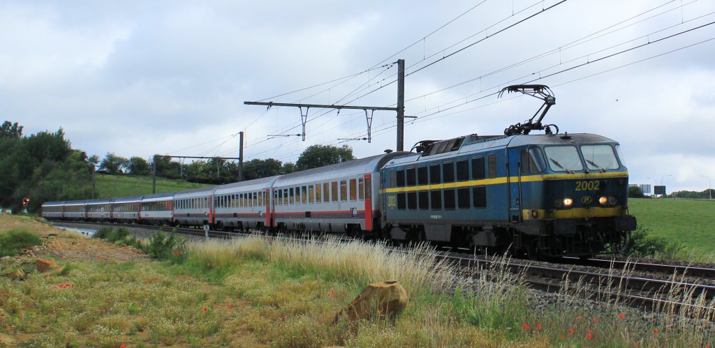 Der Express Vauban mit Lok 2002 fuhr am 8. Juli 2011 durch die Kurve bei Florée. Ausnahmsweise waren die Kurswagen Brüssel-Luxemburg keine Grossraumwagen(I10) sondern Abteilwagen(I6).