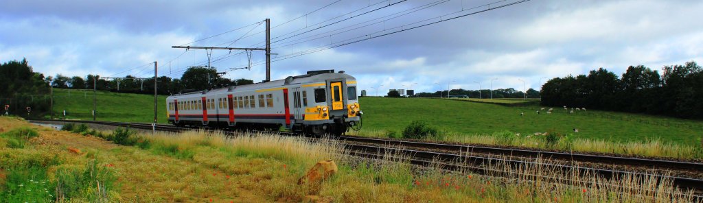 Der SNCB Altbautriebwagen 758 passiert am 8. Juli 2011 als L-Zug nach Ciney die Kurve bei Florée.